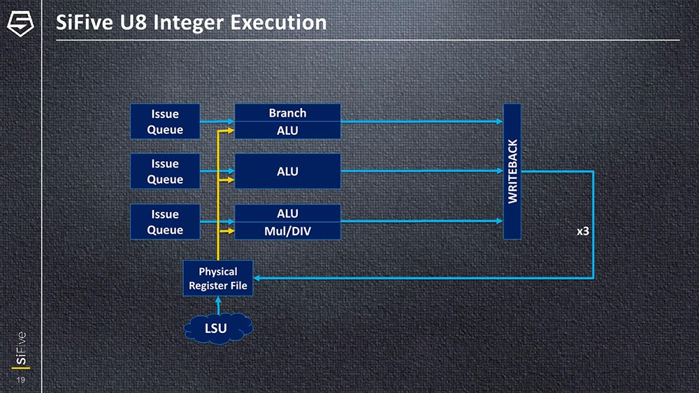 后端部分,SiFive只給了整數(shù)執(zhí)行單元的情況,整體包含3條執(zhí)行管線。每一條都有其各自的發(fā)射隊(duì)列,填充進(jìn)3條ALU管線。其中一條管線是常規(guī)的ALU,有一條則與分支單元共享了端口,還有一條更為復(fù)雜,可以執(zhí)行整數(shù)乘法和除法操作。