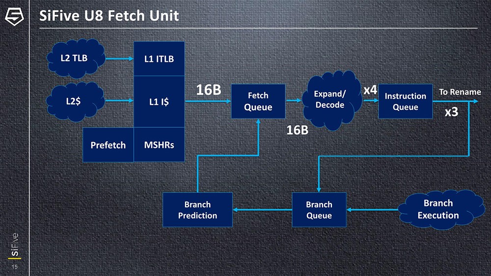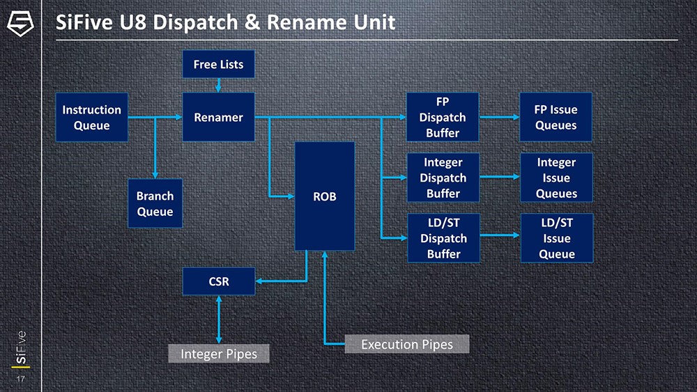 再往后,指令隊(duì)列能夠一次發(fā)射3個(gè)指令到重命名階段(rename),這個(gè)寬度就比前面收窄了。外媒AnandTech此前也在針對(duì)這部分的評(píng)價(jià)中提到,取指階段的寬度大于發(fā)射這種設(shè)計(jì),旨在發(fā)生分支預(yù)測(cè)錯(cuò)誤時(shí),讓前端能夠跟上后端;但解碼比發(fā)射更寬的這種設(shè)計(jì),以前還從未見過。猜測(cè)這可能是微架構(gòu)的某種平衡之策,也可能是為將來更寬發(fā)射的U8系列IP設(shè)計(jì)做準(zhǔn)備的。從SiFive的官方介紹來看,發(fā)射隊(duì)列數(shù)應(yīng)該是可以由芯片設(shè)計(jì)商來配置擴(kuò)展的。