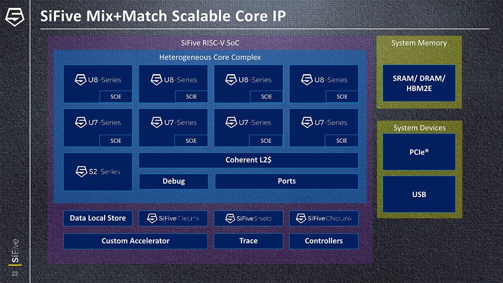 從構(gòu)成SoC/MCU的更高層級(jí)來說,SiFive采用一種名為"Mix+Match"的大小核異構(gòu)設(shè)計(jì),共享一個(gè)L2可以配置至多9個(gè)核心。核心的搭配方式,可以是U8、U7、S2這些不同的核心搭配組合。