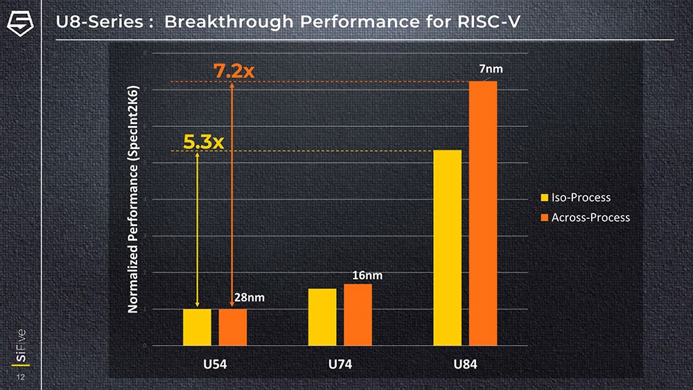 在SiFive U8系列產(chǎn)品下,目前主要包括U84、U87兩個(gè)核心IP。SiFive自己給的數(shù)據(jù)是,U84核心的性能是U74的3.1倍,IPC提升2.3倍(在最高頻率提升1.4倍的情況下)。上面這張圖對(duì)比中,在相同工藝的前提下,U84性能是U54的5.3倍;如果加上工藝造成的差別,則7nm的U84核心,性能達(dá)到了28nm的U54核心的7.2倍。這個(gè)數(shù)據(jù)其實(shí)一方面表明,RISC-V的性能潛力這些年還在挖掘過程中,所以相比更低端的產(chǎn)品能有如此巨量的性能與效率差距。